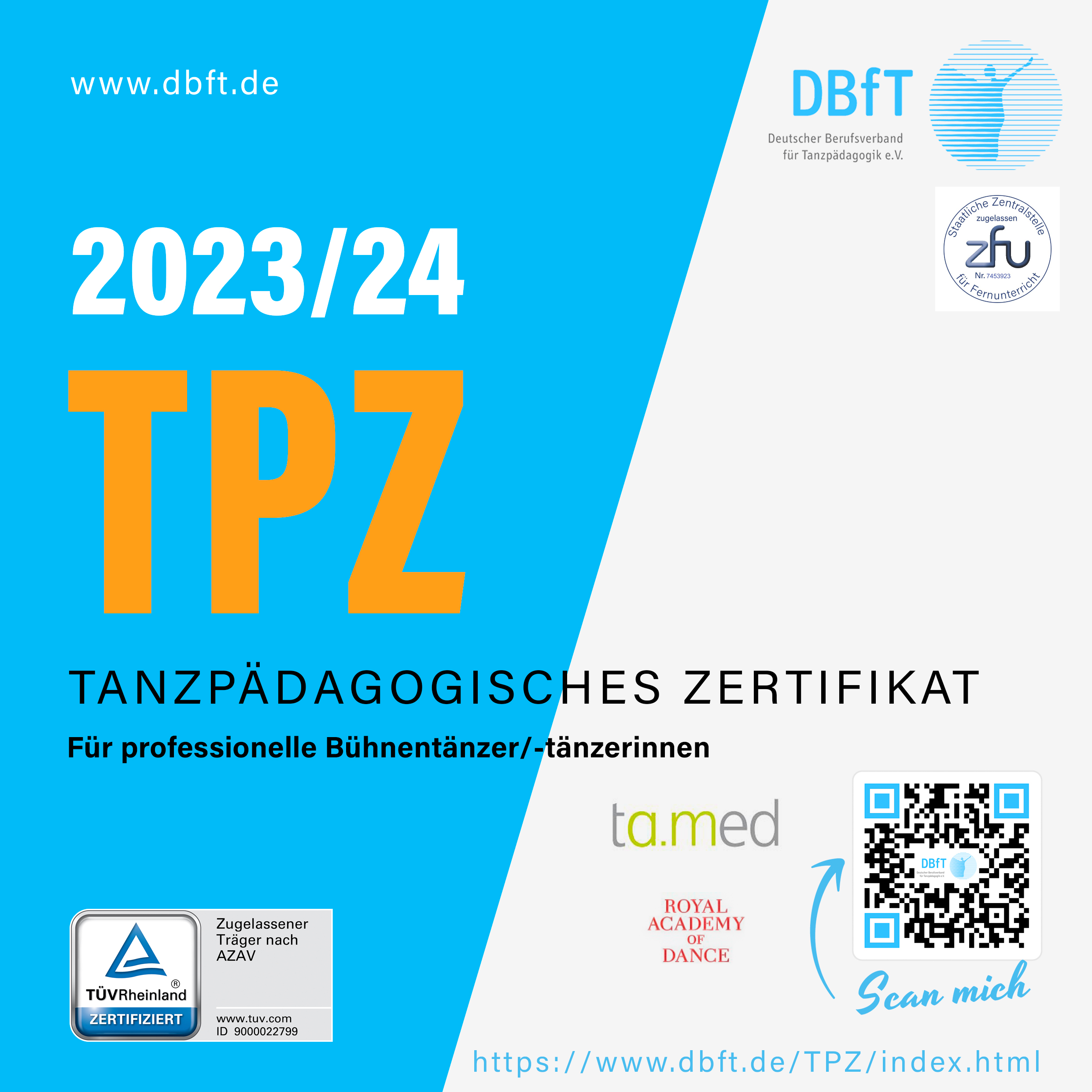 Beim TPZ Tanzpädagogisches Zertifikat des DBfT handelt es sich um ein einjähriges berufsbegleitendes Bildungsangebot, das für professionelle Tänzer* entwickelt wurde, um ihnen den reibungslosen Übergang vom Beruf des Tänzers zum Tanzpädagogen zu ermöglichen und sie somit ohne Leerzeiten in den Arbeitsmarkt (wieder) zu integrieren.